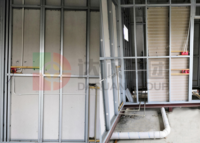 2、輕鋼龍骨安裝:房屋根據(jù)鋼構(gòu)設(shè)計定制龍骨,該結(jié)構(gòu)體系所有配件均在工廠完成生產(chǎn)加工,直接運往現(xiàn)場進行安裝,連接部位使用自攻釘進行固定。